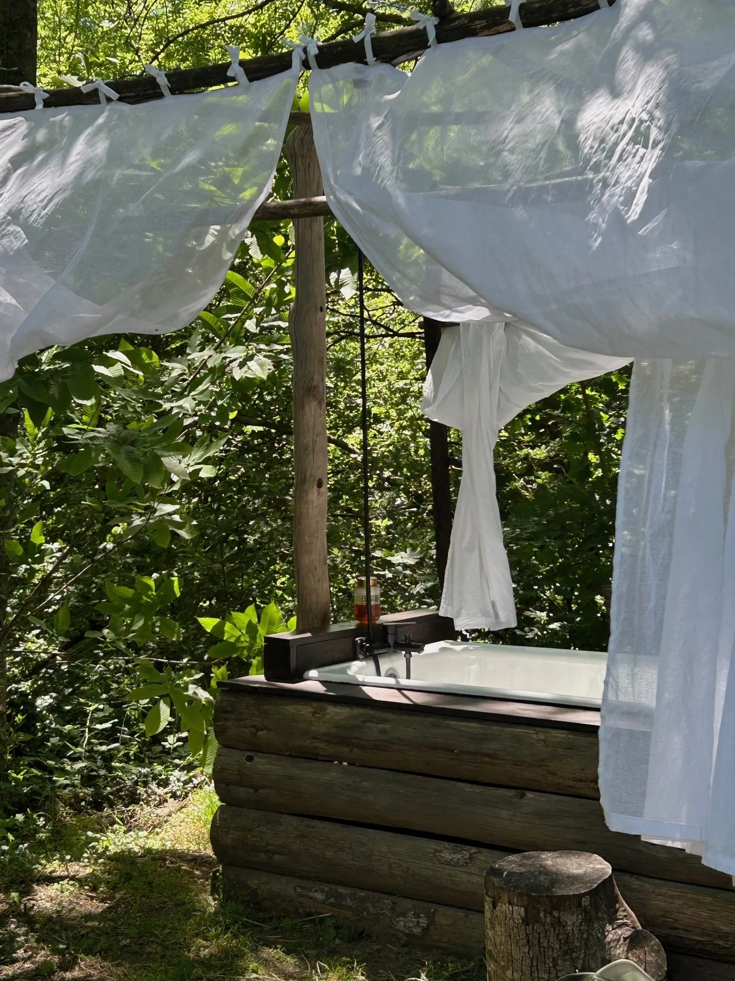 The camp has the most magical outdoor bath for bathing under the stars and a power shower set among the trees (both with ample hot water), its own composting toilet (cleaned twice a day), and hammocks for lounging.