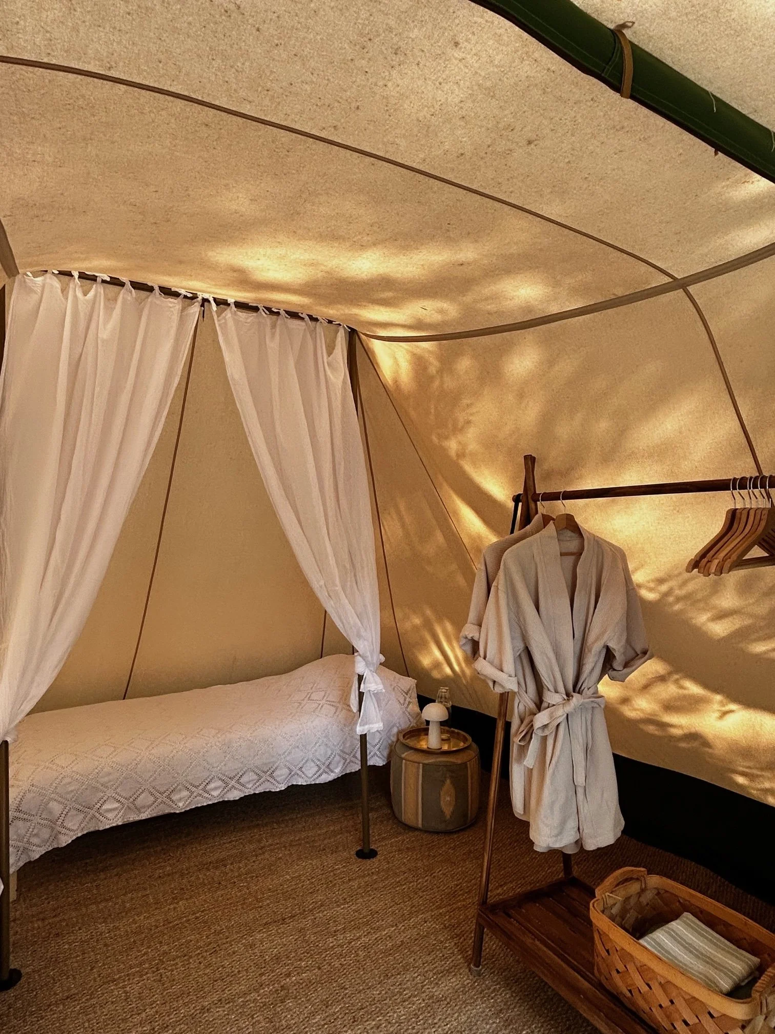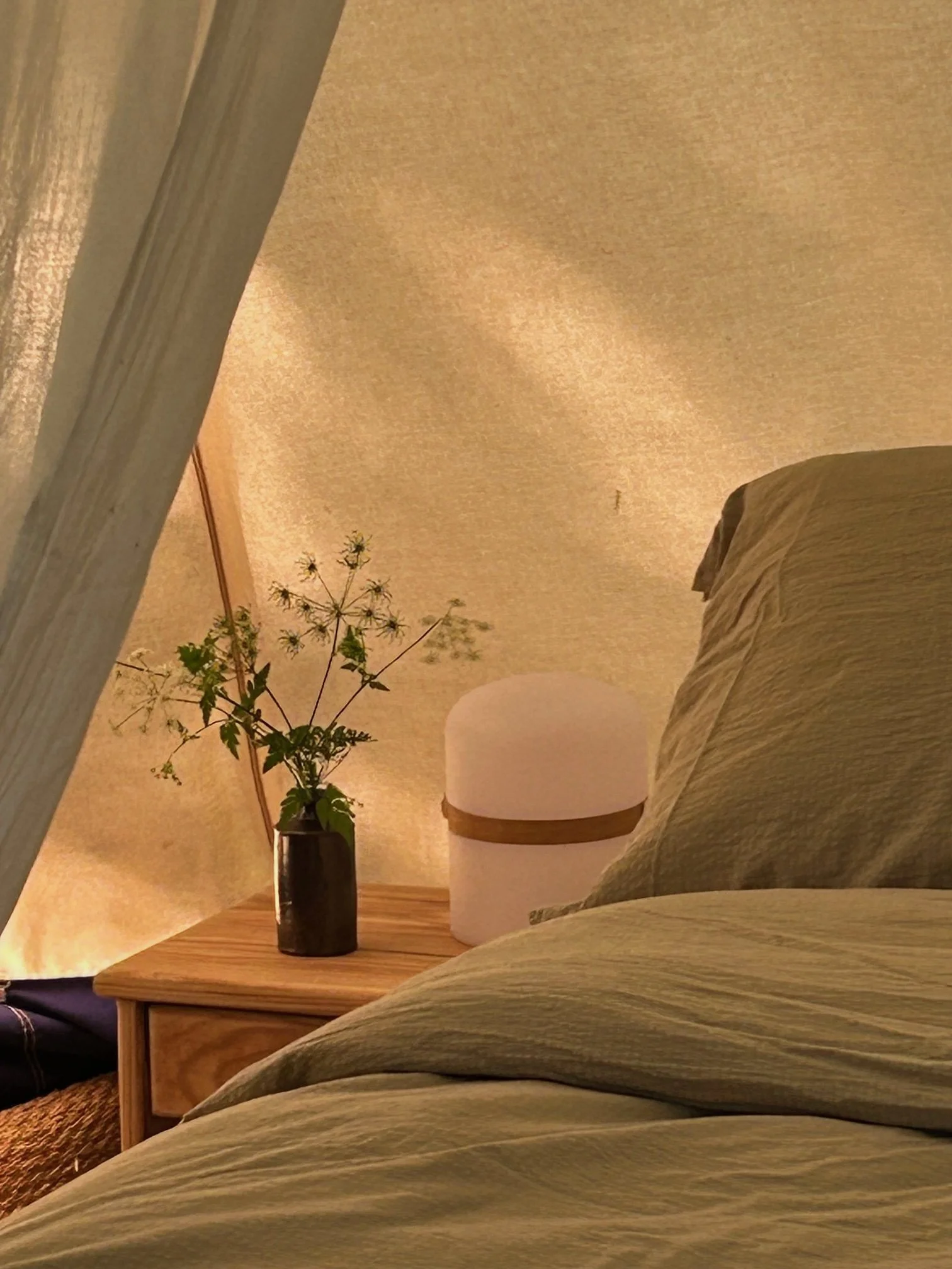 This is true forest bathing: with green space all around, come and take a hot shower next to the trees or take a bath under the light of the moon. A 24-hour soothing playlist from the birds around. Take refuge in the beautiful vintage cotton tents with real beds and all the creature-comforts.